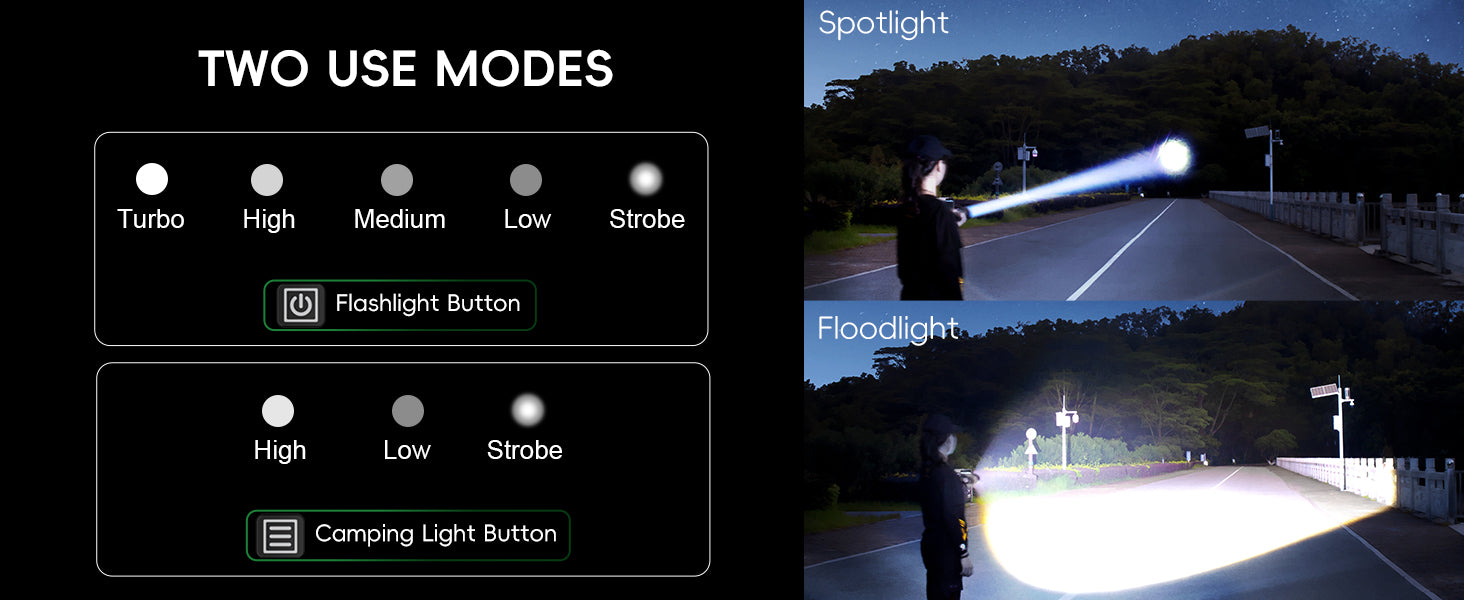 Operation Main Switch: Single click: Ultra → High → Medium → Low → Off Long press: Stepless dimming Double click: Strobe mode Camping Light Switch: Single click: Cycle brightness levels (High → Low → Flash) Long press: Switch light color (White / Warm Yellow) Auto-Off: Any mode will automatically turn off if no action is taken for over 8 seconds