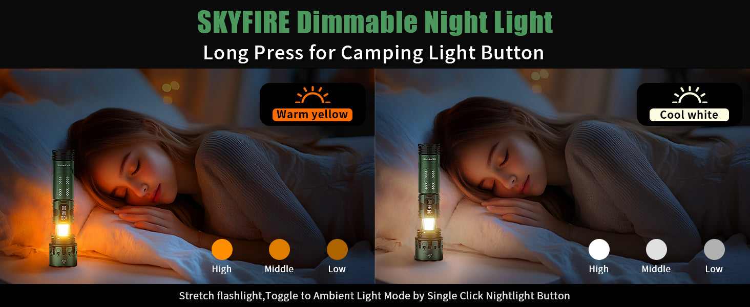 • Dual Lighting Modes: Switch between white & warm camping light.